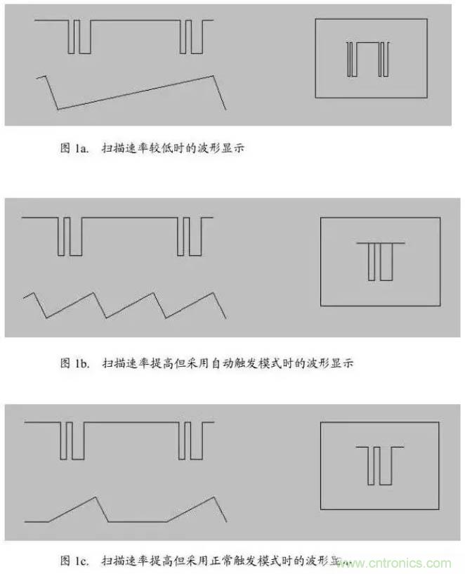 圖1 是這種情況的圖解,在圖1 中,左側上方是被觀測的波形,下方是掃描波形,右側是波形的顯示。圖1a中掃描速率較低,不便于觀察波形的細節(jié);圖1b將掃描速率提高,采用自動觸發(fā)模式,這時顯示的波形是不清晰的,有混疊現(xiàn)象;圖1c中的掃描速率與圖1b相同,但采用正常觸發(fā)方式,僅在有觸發(fā)時才進行掃描,因而顯示清晰的波形。