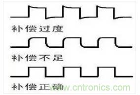 3.如果波形不正確,請調(diào)整探頭。如下圖三所示,直至波形為上面的補償正確波形。