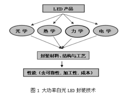 LED封裝是一個涉及到多學科(如光學、熱學、機械、電學、力學、材料、半導體等)的研究課題。從某種角度而言,LED封裝不僅是一門制造技術(Technology),而且也是一門基礎科學(Science),良好的封裝需要對熱學、光學、材料和工藝力學等物理本質的理解和應用。LED封裝設計應與芯片設計同時進行,并且需要對光、熱、電、結構等性能統一考慮。在封裝過程中,雖然材料(散熱基板、熒光粉、灌封膠)選擇很重要,但封裝結構(如熱學界面、光學界面)對LED光效和可靠性影響也很大,大功率白光LED封裝必須采用新材料,新工藝,新思路。對于LED燈具而言,更是需要將光源、散熱、供電和燈具等集成考慮。