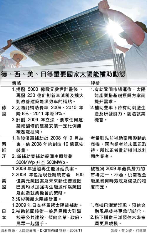 搭配各州政府自己擬定的太陽能補助政策及聯邦政府延長的太陽能補助案,目前全美有許多州都在擬定這類的太陽光電補助計劃,其中又以加州最積極;似乎一切都就緒,就等待金融風暴落底。