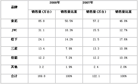 表2  2007-2008年中國數(shù)碼攝像機市場品牌銷售量結(jié)構(gòu)