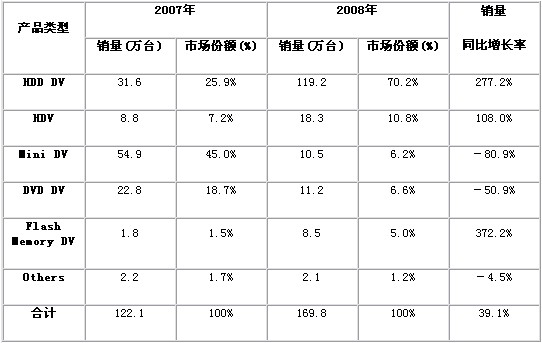 • HDD DV和Flash Memory DV同比2007年都有超過250%以上的增長