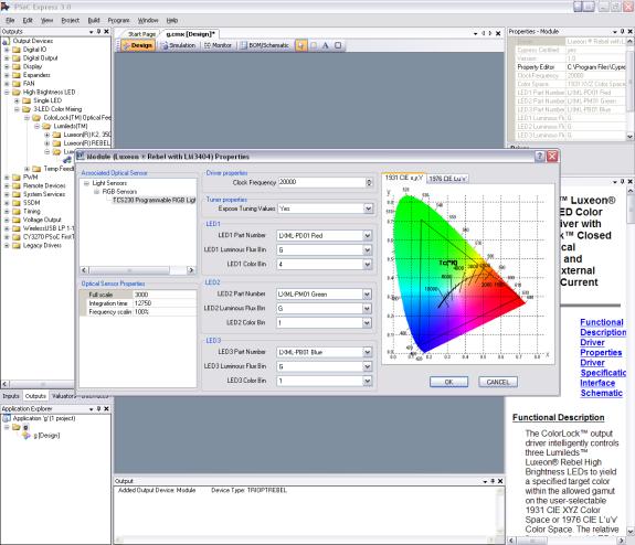 許多色彩系統(tǒng)設計擁有不同的回饋方法,需要花數(shù)個月的時間來開發(fā)韌體。解決bin的調(diào)整、溫度補償、或更高精準度的色彩回饋系統(tǒng)以及校正,都需要了解色彩科學以及精準的傳感器讀數(shù)。在展開任何高亮度LED設計時,強烈建議您先了解這些相關(guān)名詞。幸運的是,當您進入市場時,能利用Cypress Semiconductor所提供快速且輕易的PSoC Express 3.0解決方案,協(xié)助您快速展開研發(fā)。所有這些不同的回饋解決方案,以及高亮度LED的補償機制,都收錄在一個簡單易用的圖形化接口,讓您僅須使用下拉式選單以及各種校正技巧,就能完成這些設計。