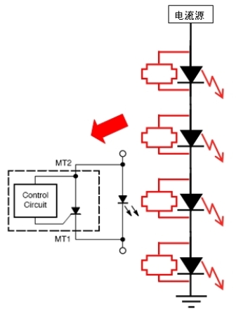 如前所述,LED是一種使用壽命極長的光源(可長達5萬小時)。除了需要針對具體的LED應用選擇適合的LED驅(qū)動解決方案,還需要為LED提供適當?shù)谋Wo,因為偶爾LED也會失效。其原因多種多樣,可能是因為LED早期失效,也可能是因為局部的組裝缺陷或是因瞬態(tài)現(xiàn)象導致失效。必須對這些可能的失效提供預防措施,特別是因為某些應用屬于關(guān)鍵應用(故障停機成本高),或是安全攸關(guān)的應用(如頭燈、燈塔、橋梁、飛行器、飛機跑道等),或是在地理上難于接近的應用(維護困難)等。在這方面,可以采用安森美半導體的NUD4700 LED分流保護解決方案。圖5是這種分流保護解決方案的應用及原理示意圖。