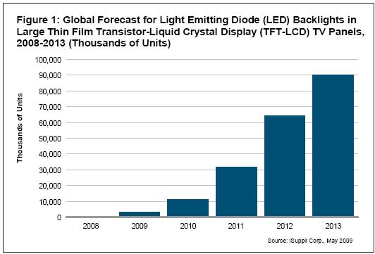 iSuppli公司預測,2009年電視產業對LED背光的接受率將為3%,到2012年將上升到30%,2013年達到39%。這相當于2013年將有9000萬個采用LED的LCD電視面板出貨,而2008年只有43.8萬個LED電視面板,期間的復合年增長率高達190.1%。