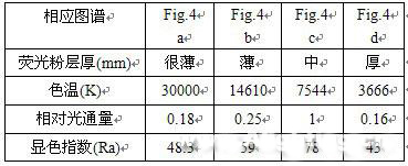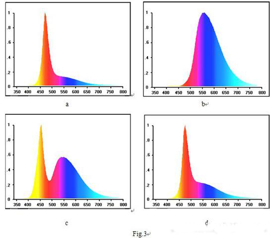 我們曾對此進行了實驗研究,我們利用某公司生產的1W高亮度藍光LED,其光譜的中心輻射波長為470nm見Fig.3,去除外封裝后分別涂敷不同厚度的輻射的中心波長為560nm的黃光熒光粉涂層,經處理后測量其發射光譜。從二十余種不同厚度的樣品中選擇了四種典型情況,其結果見Fig