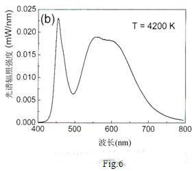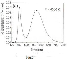 以InGaN藍光LED和1號熒光粉制成的白光LED的發射光譜示如Fig.6,其光效為55lm/W,色溫4500K。這是本人所知道白光LED的最高光效報導(據測試國內1W白光LED的光通量大多在40lm以下)。采用2號和3號混合熒光粉試制的白光LED的發射光譜示如Fig.7,其顯色指數提高到82,色溫4200K,但光效確降低到20lm/W。