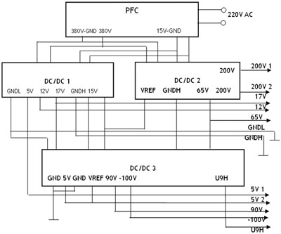 電源作為PDP的重要組成部分,要求效率高、體積小、能夠提供較大的瞬態輸出功率,并且具有保護功能和不同輸出電壓按順序啟動的功能。