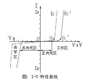 (1) 正向死區:(圖oa 或oa′段)a點對于V0 為開啟電壓,當V<Va,外加電場尚克服不少因載流子擴散而形成勢壘電場,此時R很大;開啟電壓對于不同LED其值不同,GaAs 為1V,紅色GaAsP 為1.2V,GaP 為1.8V,GaN 為2.5V。