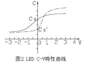 鑒于LED 的芯片有9×9mil (250×250um),10×10mil,11×11mil (280×280um),12×12mil (300×300um),故pn 結面積大小不一,使其結電容(零偏壓)Cn+pf左右。C-V 特性呈二次函數關系(如圖2)。由1MHZ 交流信號用C-V 特性測試儀測得。