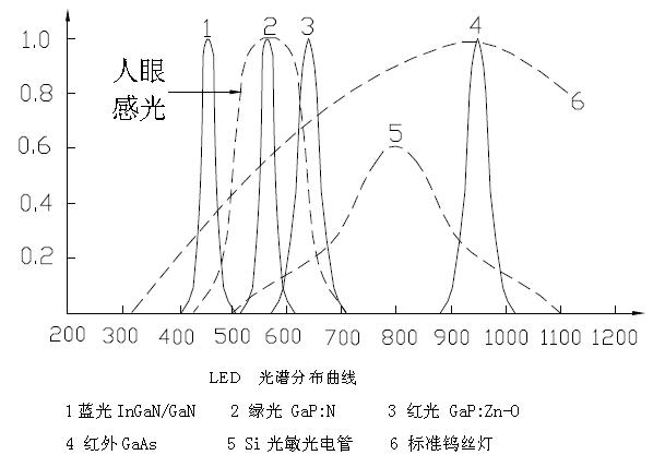 下圖繪出幾種由不同化合物半導體及摻雜制得LED 光譜響應曲線。其中