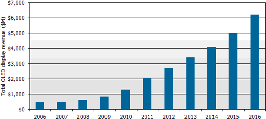根據DisplaySearch最新發表季度OLED(有機發光二極管顯示器)出貨報告指出,第二季全球OLED出貨金額創新高達1億9千2百萬美元,較上一季成長32%,與去年同期相比成長22%。DisplaySearch預測全球OLED產值將從2008年6億美元,按每年33%復合成長率成長,估計到了2016年整體產值將達到62億美元;其中手機主屏仍是最主要的應用,2016年出貨金額估計為30億美元,同時OLED TV產值將達20億美元,成為OLED第二大應用產品。