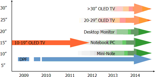 隨著技術進步,DisplaySearch預估AMOLED將進一步朝中大尺寸方向發展。筆記本計算機將是AMOLED廠商下一個關注的應用方向,我們估計自2010年年中,廠商將有機會將AMOLED應用在筆記本計算機上,而采用AMOLED面板上網本將有機會于2010年底開始量產。在TV方面,我們預期2010年底將會有大于20寸AMOLED TV被生產,同時預期2011年大于30寸AMOLED TV 將會進入市場中。