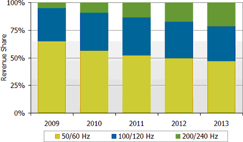 圖一 2009~2013 全球30寸及以上尺寸液晶電視按不同倍頻技術出貨金額比率