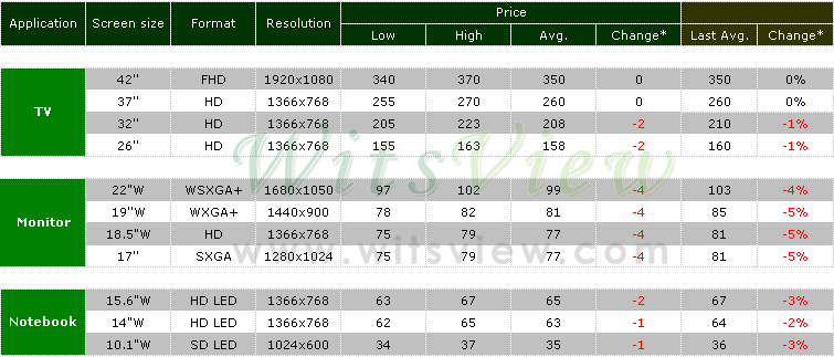 9月份筆記本電腦面板需求受惠于Windows 7新機(jī)鋪貨,下游客戶訂單量仍維持一定的水準(zhǔn),面板價格有漲有跌,上下幅度約1~2美元,一線品牌客戶價格壓力較大,在10月的面板需求將較9月份減少的影響下,估計面板價格跌幅將擴(kuò)大至2-3美元;9月份液晶電視面板價格則大致維持穩(wěn)定,小尺寸26W及32W面板在少數(shù)客戶端的價格微幅下調(diào)2~3美元,40W以上則大都持平,大陸十一國慶長假的銷售成為市場關(guān)注的焦點(diǎn),銷售結(jié)果將左右10月份電視面板價格的走勢,另一方面,由于監(jiān)視器面板產(chǎn)能已經(jīng)松動,因此估計小尺寸電視價格走勢將受牽連,下跌幅度約5-10美元。
