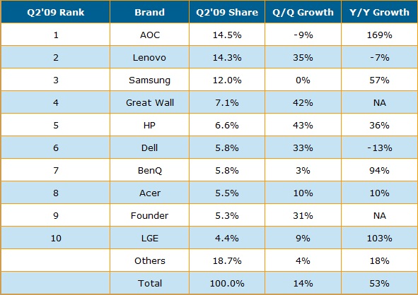 中國(guó)國(guó)內(nèi)桌上型電腦市場(chǎng)現(xiàn)階段消費(fèi)者喜歡自行組裝電腦(有時(shí)我們稱作DIY),桌上型液晶顯示器是其中一項(xiàng)只要的配件,這項(xiàng)特性也為白牌顯示器廠商提供了絕佳機(jī)會(huì)。從品牌廠商來(lái)看,2009年第二季度 AOC(冠捷)在中國(guó)成為第一大桌上型液晶顯示器品牌廠商,擊敗國(guó)內(nèi)PC品牌的領(lǐng)導(dǎo)者Lenovo(聯(lián)想),這也進(jìn)一步顯示出中國(guó)DIY市場(chǎng)強(qiáng)勁成長(zhǎng)。AOC(冠捷)是TPV旗下的主要品牌,而TPV是桌上型液晶顯示器的最大代工廠商,不僅為自己品牌代工,也為全球最大PC與桌上型液晶顯示器品牌廠商如HP, Acer, Lenovo, Dell等代工。