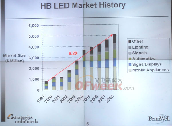 2009年LED持續擴大其在niche和通用照明領域的滲透率,2008年增長55%,2009年由于受經濟衰退的影響估計將增長15%。