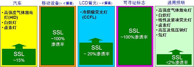 如今,在屏幕尺寸小于4英寸的手機、相機閃光等移動設備應用中,及路邊及體育場中大型顯示屏應用中,LED照明,或稱固態照明(SSL),幾乎占據了100%的份額。除此之外,LED照明也向其它領域邁進。如在汽車應用中,LED照明占據約15%的份額。而在較大液晶顯示屏(LCD)背光應用中,雖然冷陰極熒光燈(CCFL)如今仍然占據主導地位,但LED照明的總滲透率也達到約20%,參見圖1。特別是在備受矚目的大尺寸液晶電視背光應用中,據Laurent Jenck指出,預計LED背光的液晶電視在未來3到4年間,將占據至50%的份額。