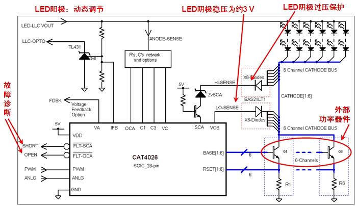 其它應用,如建筑物照明中,同樣可以采用安森美半導體的高能效LED驅動方案,如CAT4103、CAT4109三通道線性恒流驅動器是高亮度RGB LED驅動器,應用于新興的高亮度、高視覺沖擊力LED建筑物照明中的RGB LED像素控制。而CAT4106是多通道升壓型LED驅動器,適合較大尺寸的通用LCD背光應用,能夠驅動多達40個白光LED,提供總計達6 W的LED輸出功率,并幫助設計人員提升背光能效至最高。此外,采用LED背光的大尺寸液晶電視日趨多,其中尤以側光式LED背光為主,通常需要采用6個單串的LED光條(每串LED視為一個LED道)。現有6通道側光式LED電視中每個LED通道均含有專用驅動器IC、電感型DC-DC升壓轉換器及及開關。而安森美半導體應用于大尺寸側光式LED背光液晶電視的多通道線性LED驅動器CAT4026是一種高性價比方案,支持高數量的通道,能以單顆IC控制6個LED通道,能效目標范圍高于90%,能效典型值量多達94%,且針對 LED開路和過多LED短路等故障條件提供保護。CAT4026的簡略應用示意圖參見圖2。