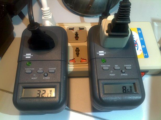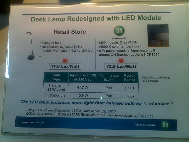 現場,Laurent為我們演示了用LED模塊代替鹵素臺燈在能效方面的差異,如下圖所示:可以看出,使用LED燈作臺燈的能耗僅相當于鹵素燈的1/4。
