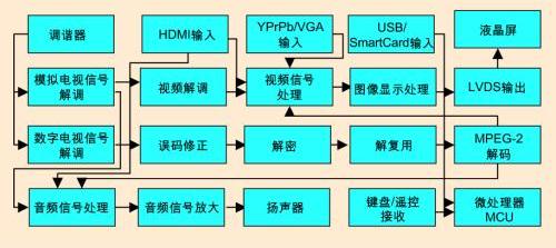 液晶高清數字電視通常由數字電視接收通道、模擬電視接收通道、音頻信號處理放大通道、視頻信號輸入處理及顯示輸出通道、微控制系統以及電源系統組成。