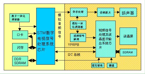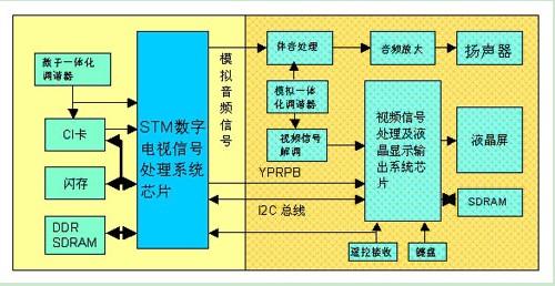 由圖2所示的數字電視接收嵌入式解決方案框圖可看出,數字一體化調諧器包括數字射頻頻率調諧和信道解碼兩部分,從接收到的數字電視射頻信號解調輸出標準的MPEG傳輸碼流信號。未特殊加密的MPEG碼流直接輸入到ST數字電視信號解碼芯片中進行處理;對于特殊加密的MPEG碼流,首先輸入到CI卡回路進行解密,再將碼流直接輸入ST數字電視信號解碼系統芯片進行處理。經ST數字電視信號解碼系統芯片的MPEG解碼和信號編碼,AD變換輸出模擬YPRPB和立體聲音頻信號,到已有的模擬電視系統顯示數字電視圖像,從而構成完整的液晶高清數字電視。
