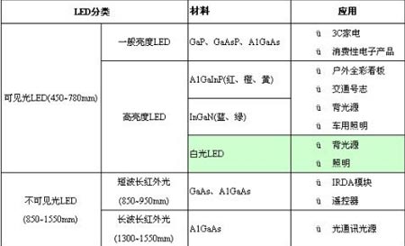 表1 LED種類及應用