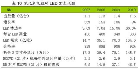 戴爾的這一舉措表明 LED 已經不再作為概念機型或者說時尚機型,而是作為標準配置,其價格策略必然不再采取高端策略。戴爾作為行業內的領導廠商之一,其他公司必然跟進。因此2009 年LED 在筆記本的滲透率有望達到20%以上。2007年全球筆記本出貨1.09 億臺,2008年增長15%,2009 年增長10%,則2009 年筆記本出貨1.4 億臺,其中將有2800 萬臺使用LED,對LED 的需求量是70.3 億粒。