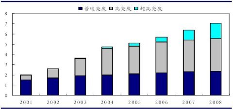 2008年全球LED市場規模約為69億美元,其中高亮度和超高亮度LED 市場年平均增長率將達到20%左右,市場規模達16億美元。在移動手機應用市場的快速推動下,過去10年高亮度LED市場的年均增長率達到46%。