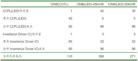 表5 不同光源12寸NB背光模組成本比較