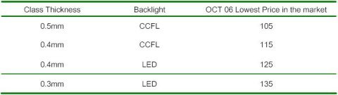 厚度方面目前LED 背光筆記本的厚度也已經取得優勢,以13.3 英寸白光LED 筆記本面板為例,厚度可以薄40%,重量可以輕20%。受下游筆記本廠商銷售策略影響2008 年LED 普及未達預期,LED 在各方面都優于CCFL,但其價格高于后者。RGB LED 背光比CCFL 背光筆記本面板貴50 至80 美元;白光LED 價格比CCFL高出不到25 美元,但白光LED 對CCFL 優勢會打折扣。目前市面上已經有多款LED 背光屏筆記本電腦,業內曾經預期2008 年LED 背光板會在NB 中大行其道,不過由于下游整機廠商2008 年仍然把LED 應用作為高端機型使用,其價格與普通筆記本的差額遠遠高過使用LED 背光源增加的成本。