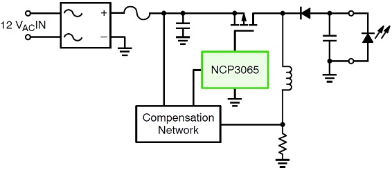 這參考設計的一項關鍵考慮因素,是在12 Vac輸入條件下,跨輸入線路變化及輸出電壓變化,實現平坦的電流穩流。這參考設計電路基于安森美半導體的NCP3065構建,工作頻率約為150 kHz,采用非隔離型配置。NCP3065是一款單片開關穩壓器,支持12 Vdc或12 Vac電源輸入,設計用于為HB-LED提供恒定電流。除了NCP3065,這參考設計還結合了自動檢測電路。這參考設計的功能框圖如圖1所示。