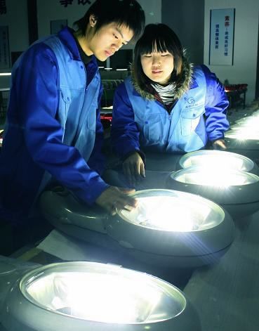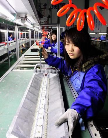 圖:天津工業大學海宇半導體照明產業化基地的員工在組裝LED照明燈