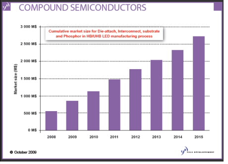 Yole公司對于HBLED的定義較其他市場研究機構為窄,僅限于每瓦功率能夠輸出30流明以上,如應用在汽車 和電視 背光的元件,但是大部分的LCD背光應用都在這個分類以外。每一封裝單位能輸出100流明以上的超高亮度LED,包括汽車大燈和一般照明使用,目前擁有兩億八千萬美元的利基市場;隨著成本逐漸改善,成長力道可以預期。