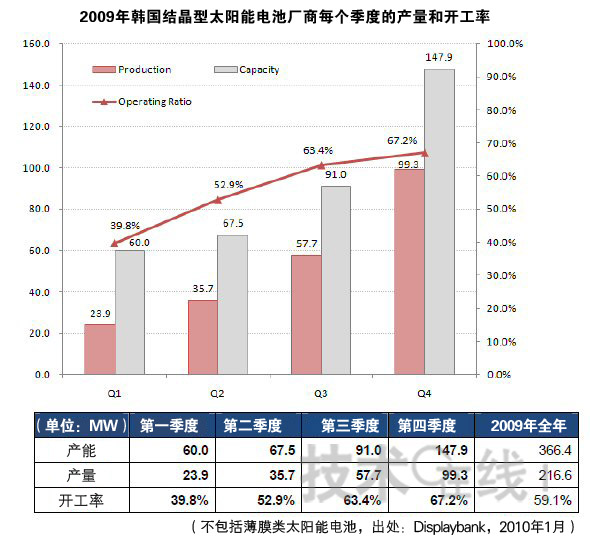 據韓國調查公司Displaybank稱,韓國結晶硅型太陽能電池廠商的設備開工率已經恢復。受經濟危機的影響,韓國結晶硅型太陽能電池廠商的設備開工率在2009年第一季度跌至39.8%,但在2009年第四季度已提高至67.2%。