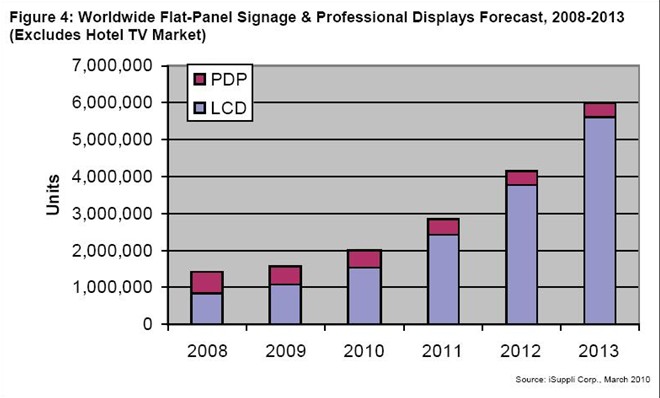 如圖所示為iSuppli公司對于平板標牌和專業顯示器的全球出貨量預測。該預測不包括酒店電視,因為有些人認為該領域不屬于這個市場。