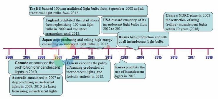 面對全球氣候變遷與不斷高漲的能源價格,各國政府都已經開始把一些高耗能的產品列為首要的禁用對象,例如白熾燈泡就是最為明顯的桉例。白熾燈泡的禁用首先從歐盟與日本最先開始發酵,后來各國政府也開始陸續跟進。從各國禁用白熾燈泡的時間表來觀察,LEDinside表示,2012年之后,大多數國家開始逐步禁用白熾燈泡,也為LED照明帶來龐大的商機。