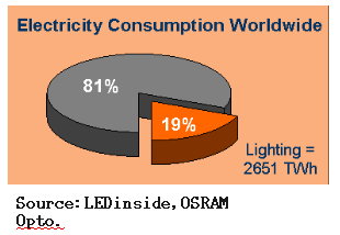 依現階段照明占全球電力消耗的比重達19%,耗能總量達到2651 TWH。如果能夠將現有的光源替換成節能光源,預計將可以省下30%能源消耗。若再進一步將節能光源與感測器、智能電網等相關應用作結合,預計還可以再節省30%的能源消耗。 如果到2030年能夠節省50%的能耗,相當于減少20億桶的石油的二氧化碳排放量。