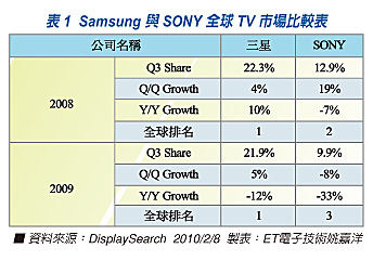 根據(jù)DisplaySearch研究指出,2009第三季全球電視品牌出貨金額排名與市佔(zhàn)率,三星皆為第一名,遠(yuǎn)勝暫居第三的SONY(見圖一),但是就三星現(xiàn)階段的作法來看,三星似乎不滿足,對於OLED TV與3DTV等產(chǎn)品線,三星集團(tuán)早已極積佈局。而就2010的CES展來看,三星推出65吋的3DTV,其中內(nèi)建3D處理器,可將2D內(nèi)容轉(zhuǎn)換成3D,同時(shí),三星也會(huì)推出藍(lán)光播放機(jī),同時(shí)支援3D內(nèi)容播放。