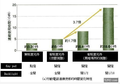 如圖2所示,照度感測(cè)元件具備感測(cè)夜間戶外只有(Lux;照度單位),乃至于晴天戶外亮度超過的特性,換句話說若能充分應(yīng)用上述特性并作精密控制,理論上可以徹底解決各種電子設(shè)備因光源造成的影像不良等問題。例如照度感測(cè)元件可以隨時(shí)偵測(cè)周圍環(huán)境的光量多寡,自動(dòng)調(diào)整背光模阻的點(diǎn)燈狀況,進(jìn)而有效降低可攜式電子產(chǎn)品的電池消費(fèi)電力(耗電量),同時(shí)延長(zhǎng)通話與待機(jī)時(shí)間與電池的使用壽命(圖3(a))。