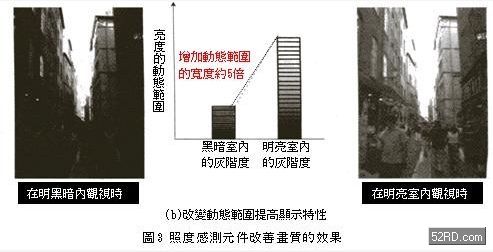 有關(guān)液晶電視的應(yīng)用,主要是液晶顯示器的點(diǎn)燈時(shí)間越久消費(fèi)電力就越大,相對(duì)的散熱處理與散熱風(fēng)扇的噪音則變成非常棘手的問題,尤其是目前大型液晶電視的輝度大多超過時(shí),在明亮室內(nèi)畫面非常的亮麗,不過在黑暗室內(nèi)卻會(huì)出現(xiàn)波紋現(xiàn)象,而且畫面太亮容易造成眼睛疲勞,黑暗色影像的黑色浮動(dòng)現(xiàn)象非常明顯,影像對(duì)比則大幅降低。由于一般液晶電視是根據(jù)各畫素的液晶穿透率,調(diào)整背光模組的光線達(dá)成灰階化顯示目的,然而過多的背光模組光量卻有漏光之虞,如果利用照度感測(cè)元件偵測(cè)液晶電視視聽環(huán)境的亮度,依此調(diào)整背光模組的輝度,除了影像黑色浮動(dòng)之外,灰階數(shù)相同的條件下還可以縮小亮度的動(dòng)態(tài)范圍(dynamicrange),進(jìn)而提高黑色影像表現(xiàn)能力(圖3(b)),并降低最大輝度解除影像太亮的困擾,這意味著觀賞液晶電視時(shí),消費(fèi)者不會(huì)受到視聽環(huán)境的影響,隨時(shí)可以獲得細(xì)膩的影像。