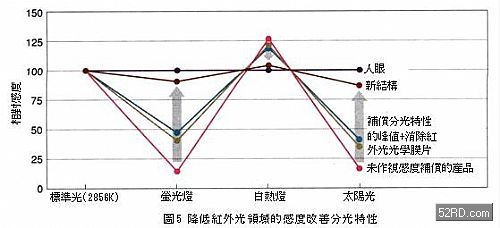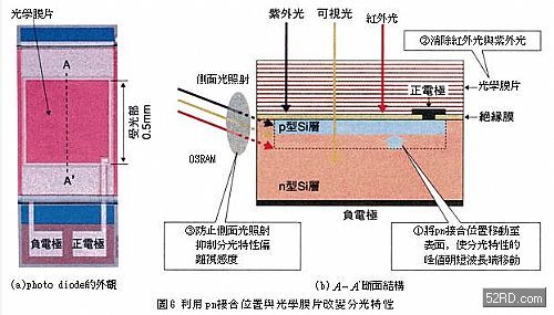 如圖6所示,分光特性可透過照度感測(cè)元件結(jié)構(gòu)上的改良獲得調(diào)整,基本上它是改變的接合位置(吸光產(chǎn)生電力),同時(shí)配合分光特性的峰值利用光學(xué)濾光片(filter)去除紫外光與紅外光。新日本無線根據(jù)上述動(dòng)作原理進(jìn)行分光特性最佳化設(shè)計(jì),再以光罩(mask)遮斷從光二極管側(cè)面入射的光線,藉此捨棄光學(xué)濾光片傳統(tǒng)結(jié)構(gòu);德國(guó)OSRAM則採(cǎi)用新材質(zhì)與新結(jié)構(gòu),未使用傳統(tǒng)的改善對(duì)策,大幅提升照度感測(cè)元件的分光特性。