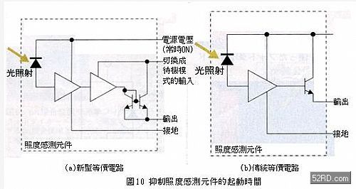 由于照度感測(cè)元件受光時(shí)會(huì)消耗電力,因此利用電池驅(qū)動(dòng)的電子設(shè)備,尤其是可攜式電子產(chǎn)品為抑制電池的消耗電力,所以大多採(cǎi)用間斷式驅(qū)動(dòng)照度感測(cè)元件,然而照度感測(cè)元件的電源電壓頻繁的ON/OFF動(dòng)作,對(duì)PhotoIC而言起動(dòng)時(shí)間最少需要,這段期間卻形成所謂的「電力損失」,因此東芝公司針對(duì)上述問題,常時(shí)對(duì)增幅電路施加電壓,同時(shí)在增幅電路后段設(shè)置切換電路(圖10),試圖藉此電路縮短起動(dòng)時(shí)間并降低消耗電力,根據(jù)測(cè)試結(jié)果顯示消耗電力是傳統(tǒng)元件一半以下。