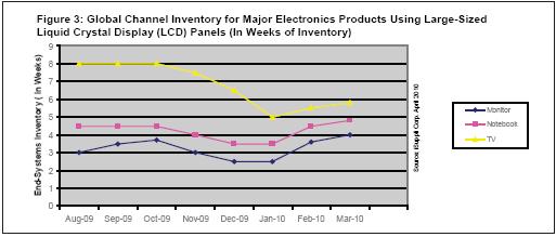 雖然庫存上升,但美國市場上的液晶電視庫存仍保持正常至健康的水平,有利于電視廠商清理舊型號產品和增加新產品。但是,中國市場的電視渠道庫存現在多于兩周,高于正常水平。這導致出現減少面板訂單的現象,4月面板需求走軟,尤其是來自中國的需求。