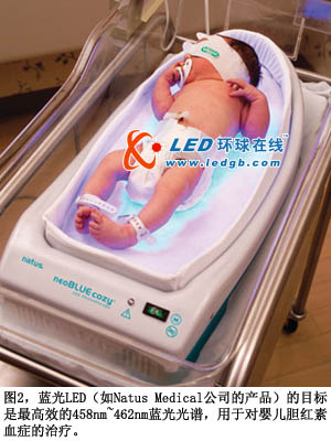 所幸,光療通常對(duì)此種病癥有效果,因?yàn)槟懠t素會(huì)吸收藍(lán)光,分解為水溶形式而排出體外(圖2)。458nm~462nm區(qū)域中的窄帶藍(lán)光最有效。過去,膽紅素治療光線都采用定制的藍(lán)色熒光燈管和彩色過濾器。但是,熒光燈的光譜相對(duì)較寬。盡管其分布中心位于所需波長上,但光譜分布在兩端下降,表示能破壞膽紅素的光能量下降,因此治療時(shí)間將延長。與之相比,藍(lán)光LED膽紅素光源可以有正確的頻率,幾乎不浪費(fèi)光能量。另外,LED的膽紅素光源有機(jī)械穩(wěn)定特性,更長的壽命,也比熒光設(shè)備低廉。在未來,光線療法將能通過“發(fā)光服”提供光照,提供比光箱更有效的治療方法。
