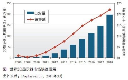 - DisplaySearch預測3D顯示器出貨量將從2008年的70萬個增長到2018年的1.96億個