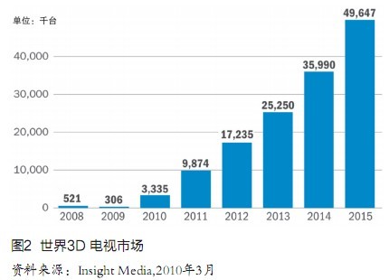 Insight Media市場研究公司3月發(fā)表的最新報告更加樂觀,預測世界3D電視市場將從今年的340萬臺飚升到2015年的4965萬臺,增長10倍還多(圖2),屆時占有率將超過20%。其對手公司iSupp1i公司尤其樂觀,認為同期世界3D電視市場將從420萬臺竄升到7800萬臺,占有率達40%,銷售額644億美元。