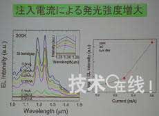 另外,該元件還呈現出如果增加注入電流、發光強度就會大幅提高的傾向,因此丸泉表示,“如果通過光子結晶形成共振器構造,就應該會產生激光振蕩。今后計劃將發光波長變更為可用于通信的1.5μm頻帶。將在2~3年后開發出作為光開關工作的元件,并實現實用化”。
