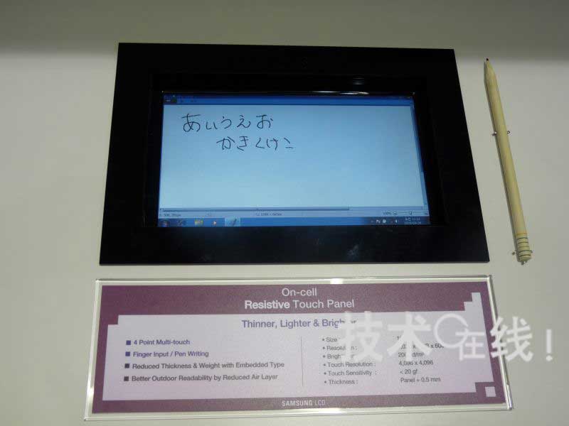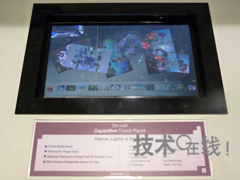韓國三星電子此次展出了兩款內(nèi)置觸摸面板功能的On Cell方式液晶面板。分別為是(1)嵌入電阻膜式觸摸面板功能的10.1英寸液晶面板,以及(2)嵌入靜電容量式觸摸面板功能的13.3英寸液晶面板。兩款產(chǎn)品均可4點(diǎn)輸入。目前正以2011年開始量產(chǎn)為目標(biāo)推進(jìn)開發(fā)。