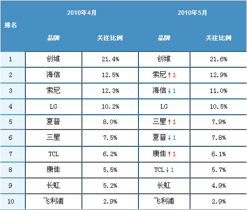 2010年5月,中國液晶電視市場最值得注意的即為索尼品牌的關注比例較海信高出1.9%,成功超越海信成為關注品牌亞軍。